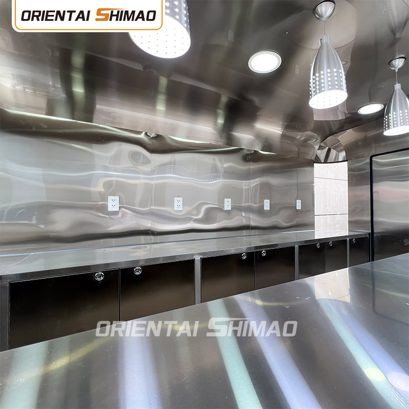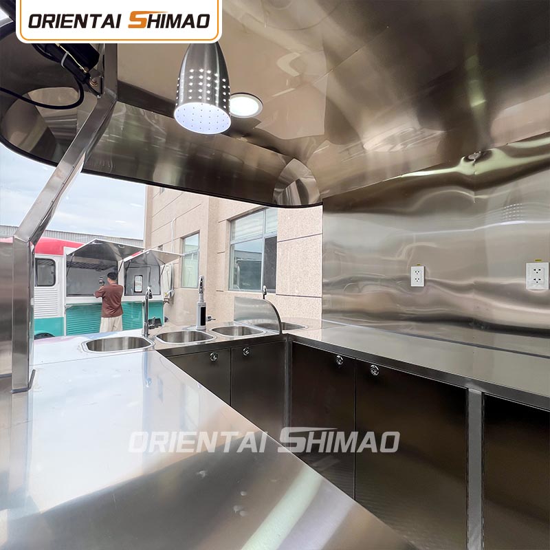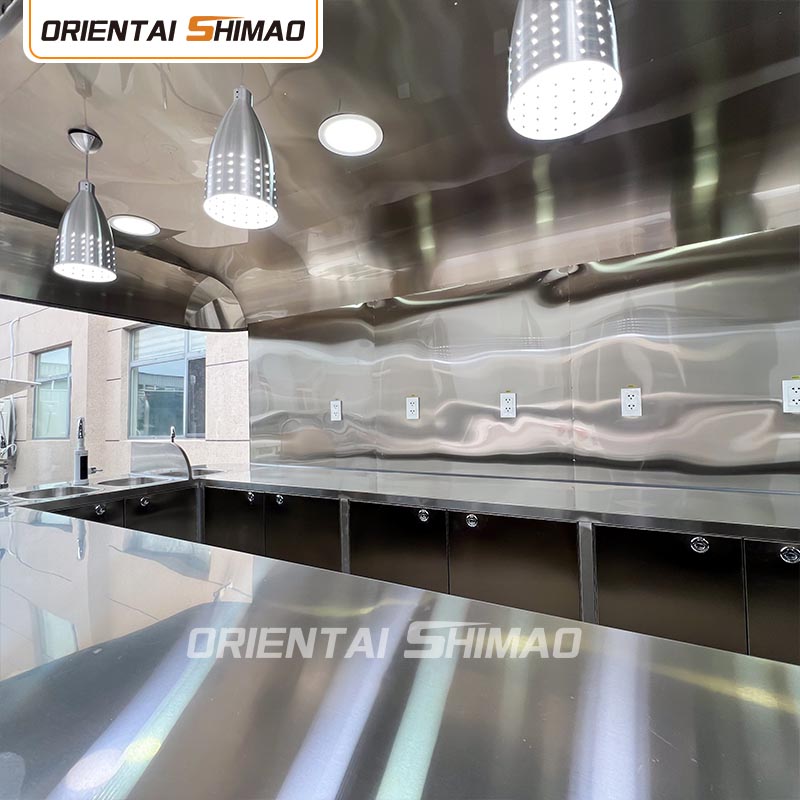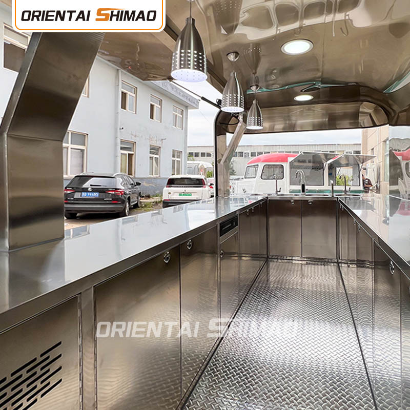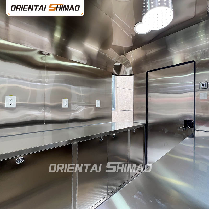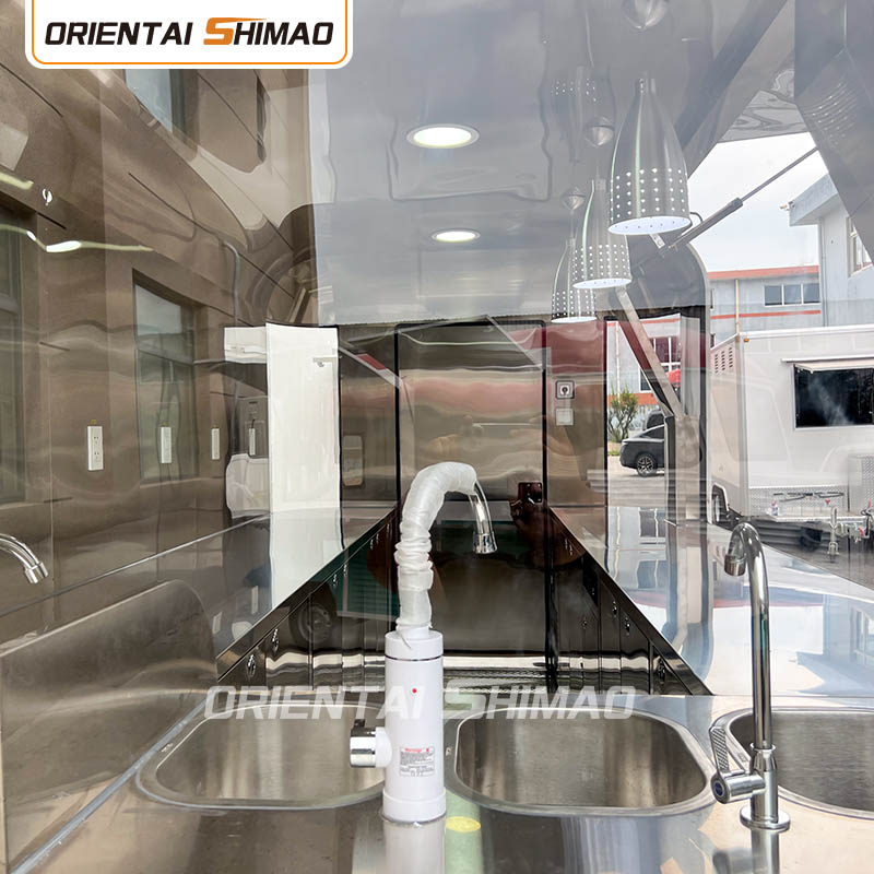 Gyllene rostfritt stål: utsidan av foodtrucken är gjord av högkvalitativt gyllene rostfritt stål. Detta material har inte bara utmärkt korrosions- och nötningsbeständighet, utan också det gyllene utseendet ökar den visuella skönheten och högkvalitativa känslan, så att foodtrucken kan sticka ut i olika miljöer.