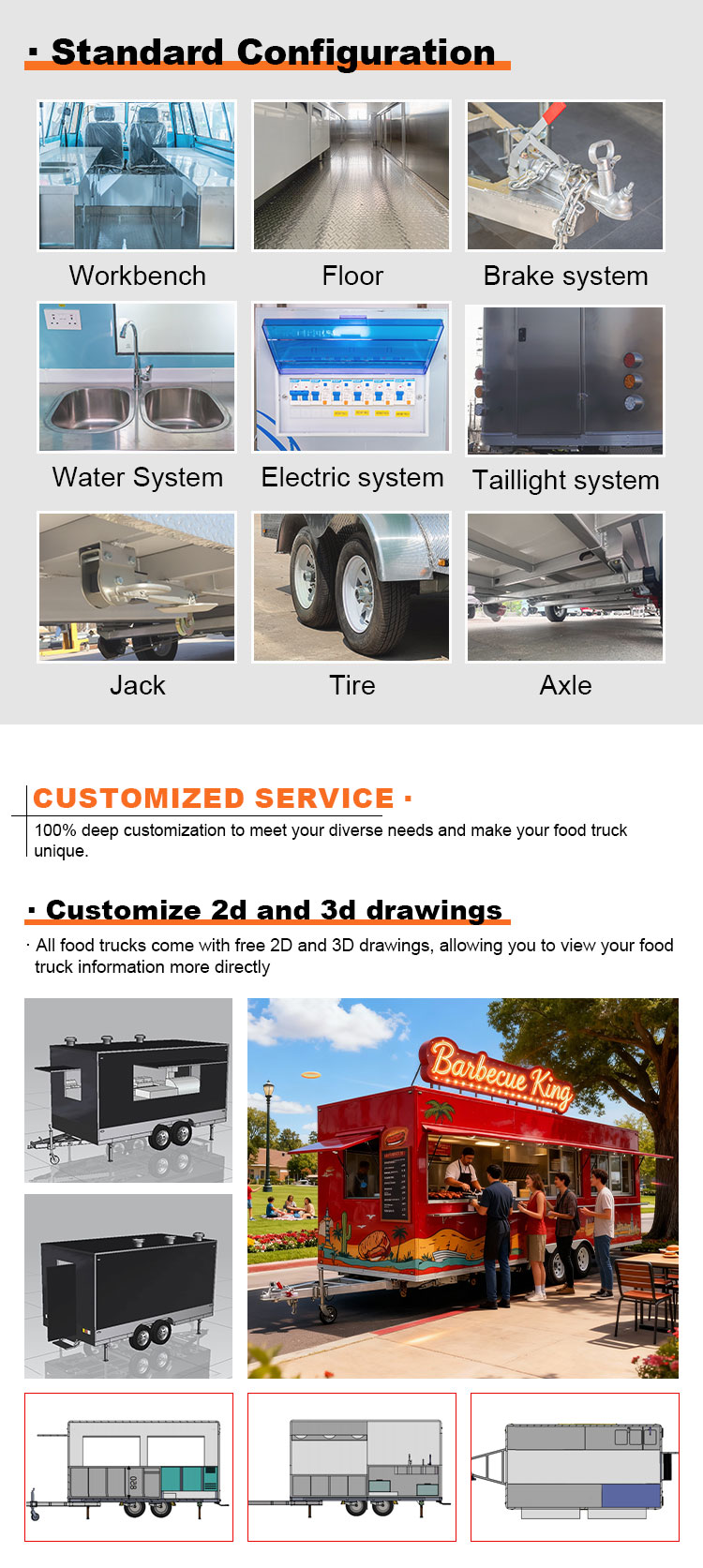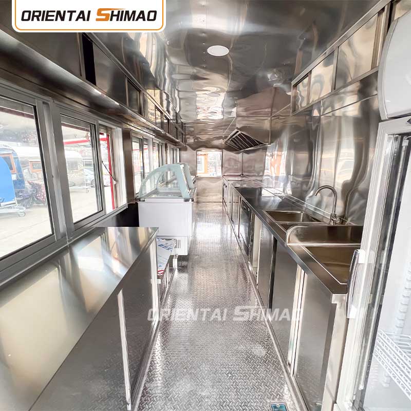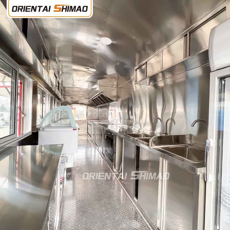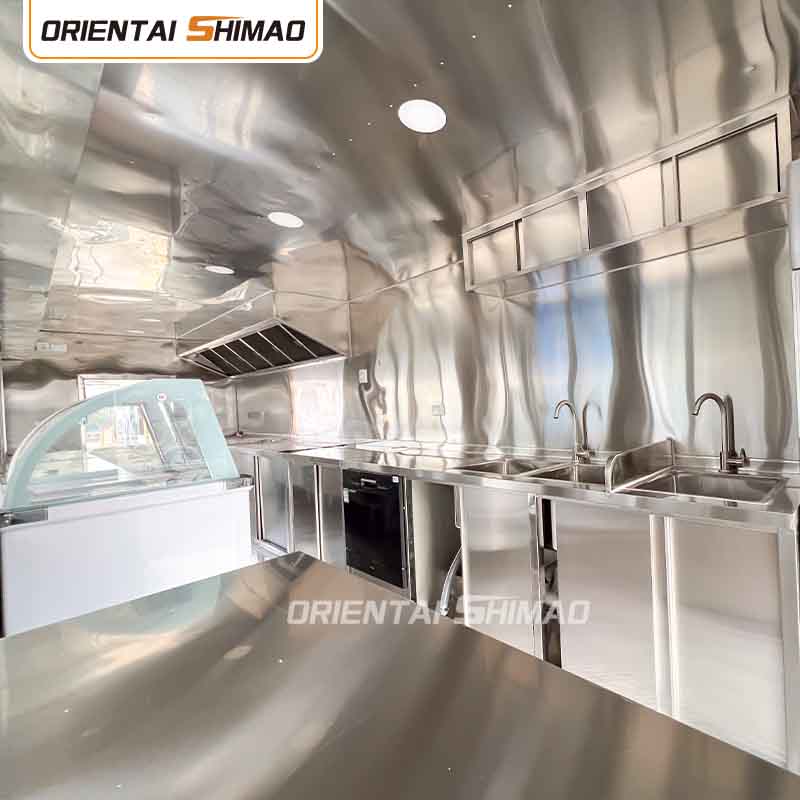 Som huvudmaterial valde vi högkvalitativt 304 rostfritt stål, som är känt för sin utmärkta korrosionsbeständighet och utmärkta hållbarhet, och kan bibehålla stabila prestanda under en mängd olika miljöförhållanden, vilket säkerställer att våra Food Catering Trailers-produkter kan behålla sin utmärkta kvalitet och funktionalitet även på lång sikt och möta en mängd olika utmaningar. 304 rostfritt ståls utmärkta motståndskraft mot korrosion, så att Lastbilen inte är lätt att påverkas av oxidation eller rost, vilket avsevärt förlänger dess livslängd. Den utmärkta korrosionsbeständigheten hos 304 rostfritt stål gör lastbilen mindre mottaglig för oxidation eller rost, vilket avsevärt förlänger deras livslängd.
