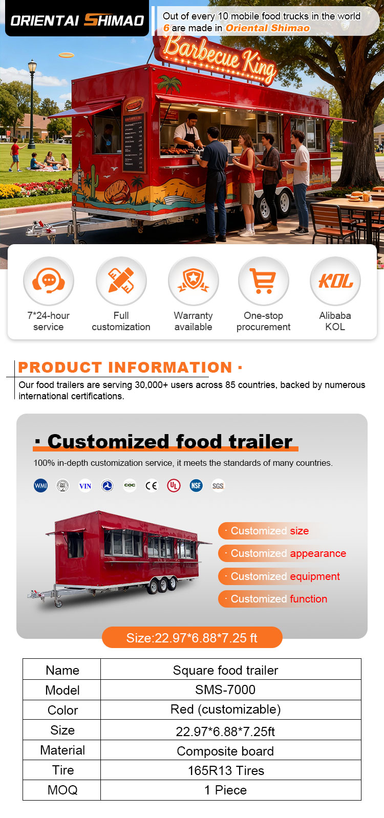 Vi kan erbjuda Food Catering Trailers certifieringar: DOT, CE, SGS, SCI, ISO, COC,