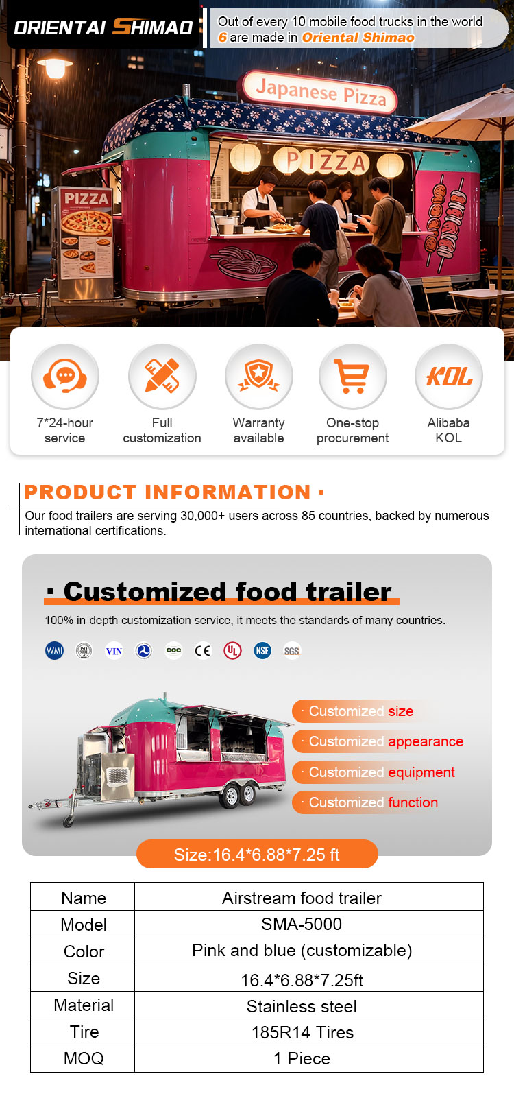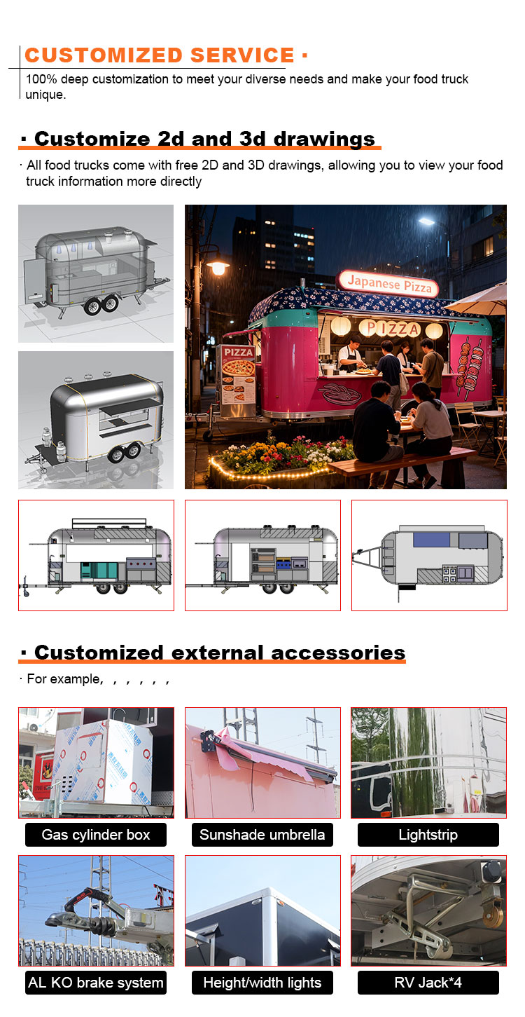 Som huvudmaterial valde vi högkvalitativt 304 rostfritt stål, som är känt för sin utmärkta korrosionsbeständighet och utmärkta hållbarhet, och kan bibehålla stabila prestanda under en mängd olika miljöförhållanden, vilket säkerställer att våra Food Catering Trailers-produkter kan behålla sin utmärkta kvalitet och funktionalitet även på lång sikt och möta en mängd olika utmaningar. 304 rostfritt ståls utmärkta motståndskraft mot korrosion, så att Lastbilen inte är lätt att påverkas av oxidation eller rost, vilket avsevärt förlänger dess livslängd. Den utmärkta korrosionsbeständigheten hos 304 rostfritt stål gör lastbilen mindre mottaglig för oxidation eller rost, vilket avsevärt förlänger deras livslängd.