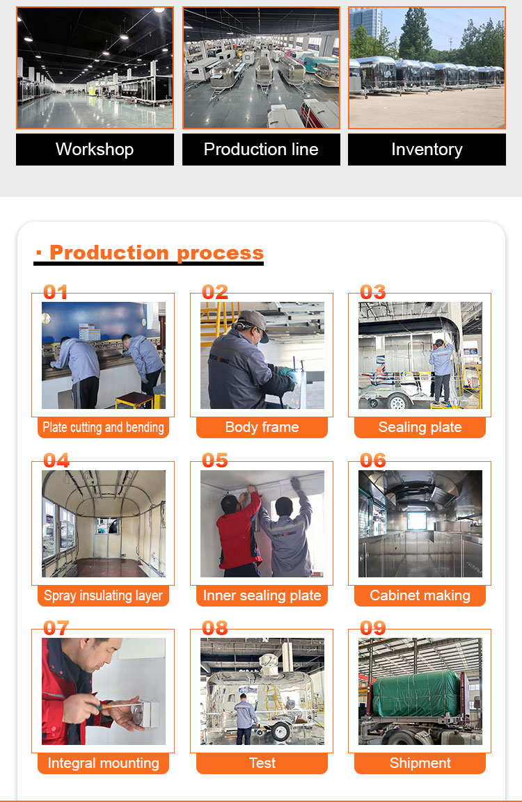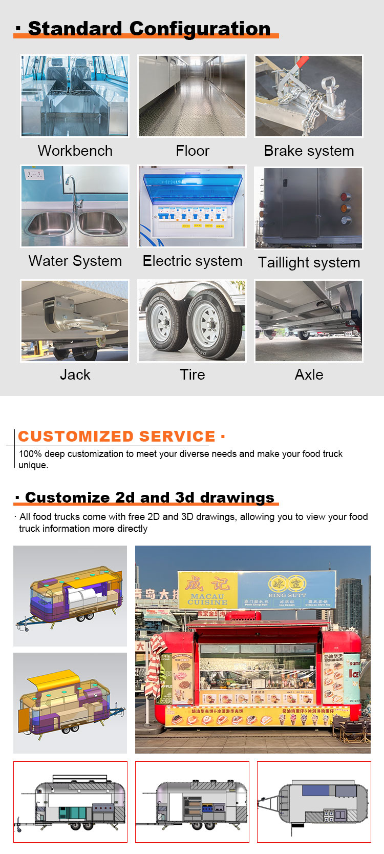 Som huvudmaterial valde vi högkvalitativt 304 rostfritt stål, som är känt för sin utmärkta korrosionsbeständighet och utmärkta hållbarhet, och kan bibehålla stabila prestanda under en mängd olika miljöförhållanden, vilket säkerställer att våra Food Catering Trailers-produkter kan behålla sin utmärkta kvalitet och funktionalitet även på lång sikt och möta en mängd olika utmaningar. 304 rostfritt ståls utmärkta motståndskraft mot korrosion, så att Lastbilen inte är lätt att påverkas av oxidation eller rost, vilket avsevärt förlänger dess livslängd. Den utmärkta korrosionsbeständigheten hos 304 rostfritt stål gör lastbilen mindre mottaglig för oxidation eller rost, vilket avsevärt förlänger deras livslängd.