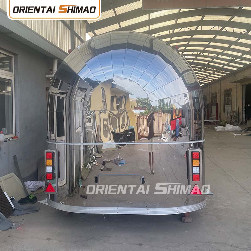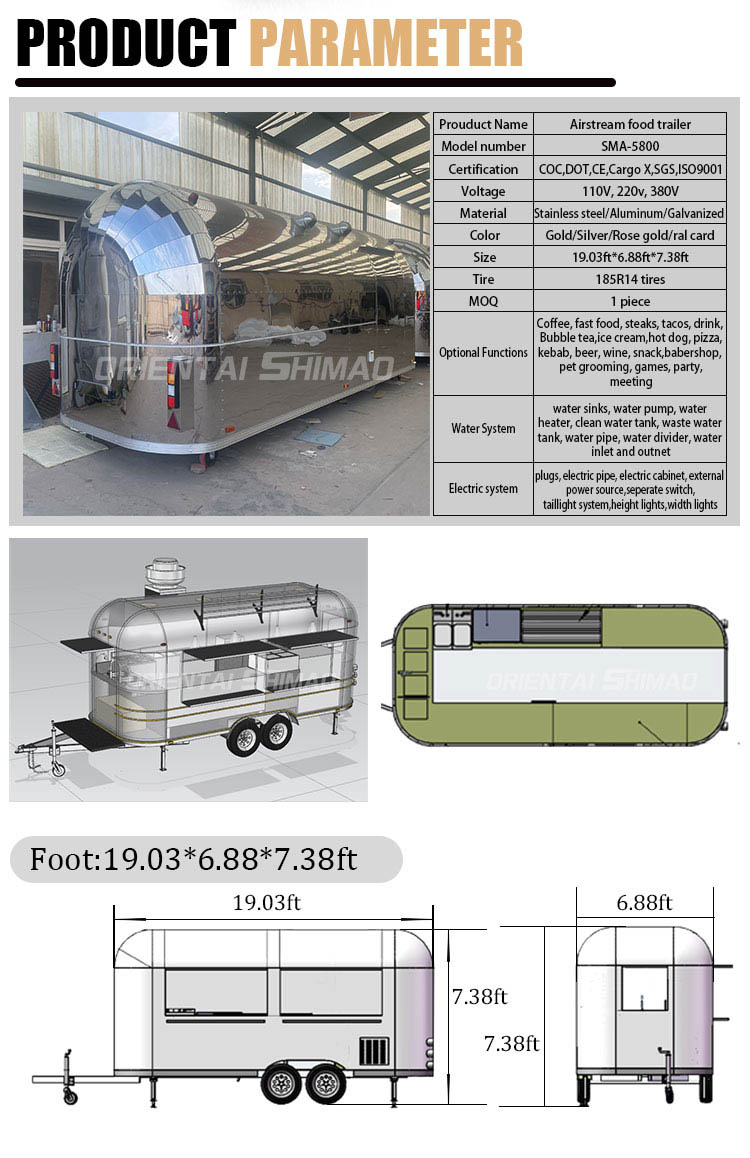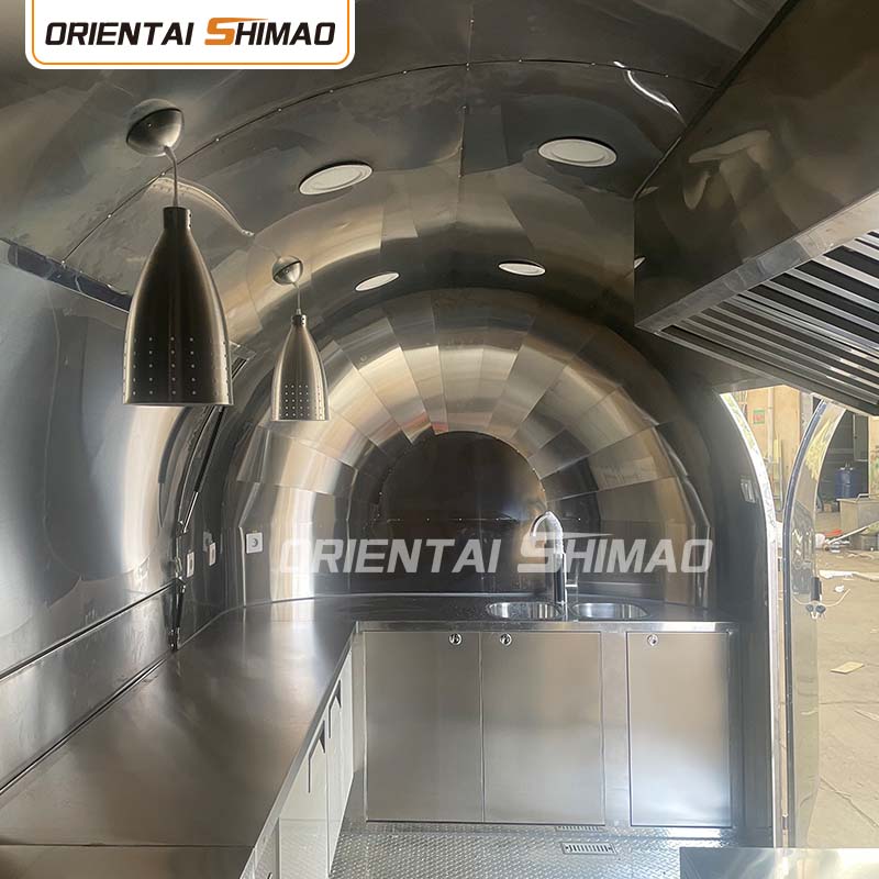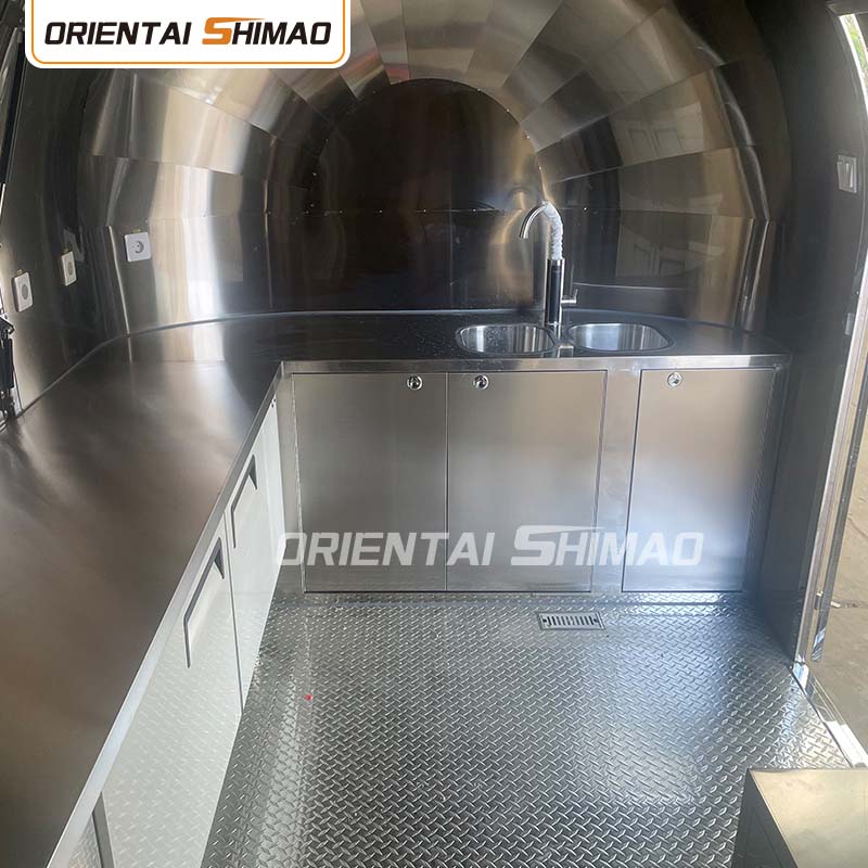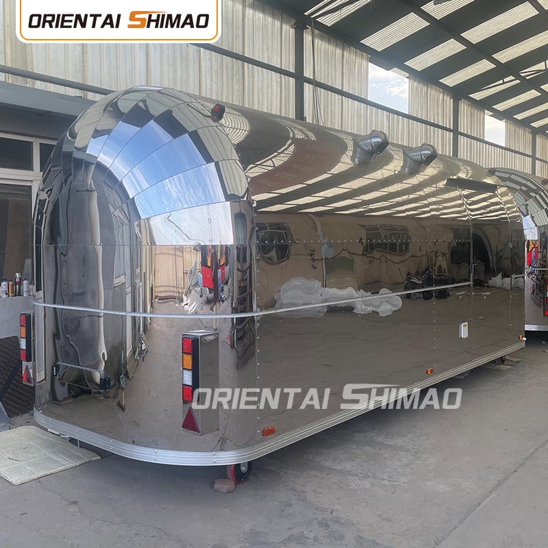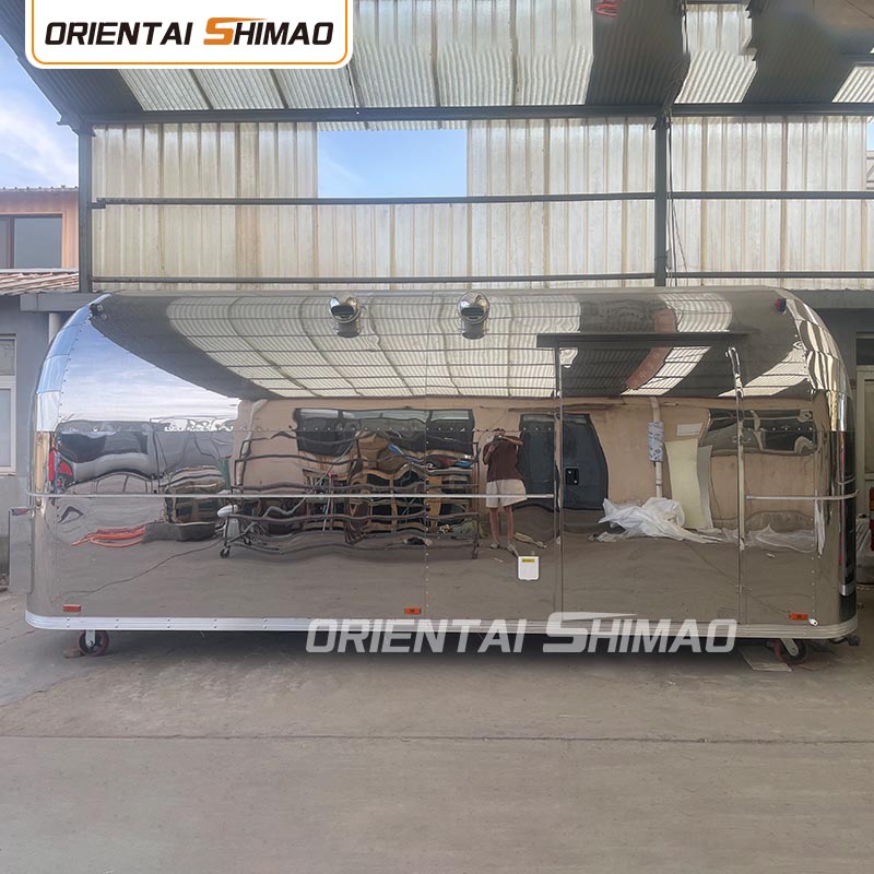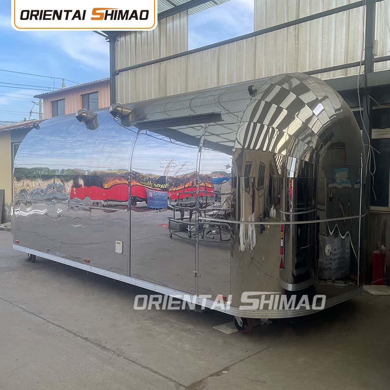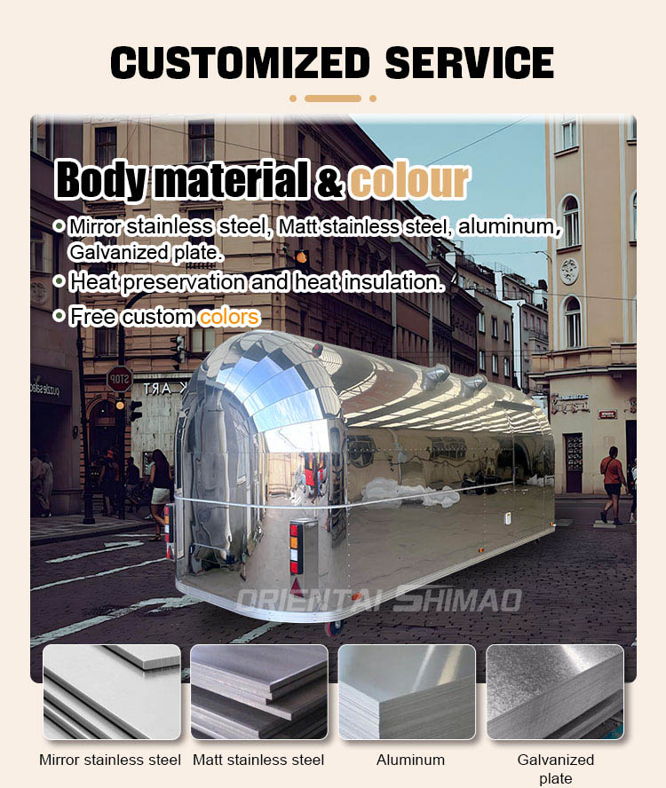 Gyllene rostfritt stål: utsidan av foodtrucken är gjord av högkvalitativt gyllene rostfritt stål. Detta material har inte bara utmärkt korrosions- och nötningsbeständighet, utan också det gyllene utseendet ökar den visuella skönheten och högkvalitativa känslan, så att foodtrucken kan sticka ut i olika miljöer.