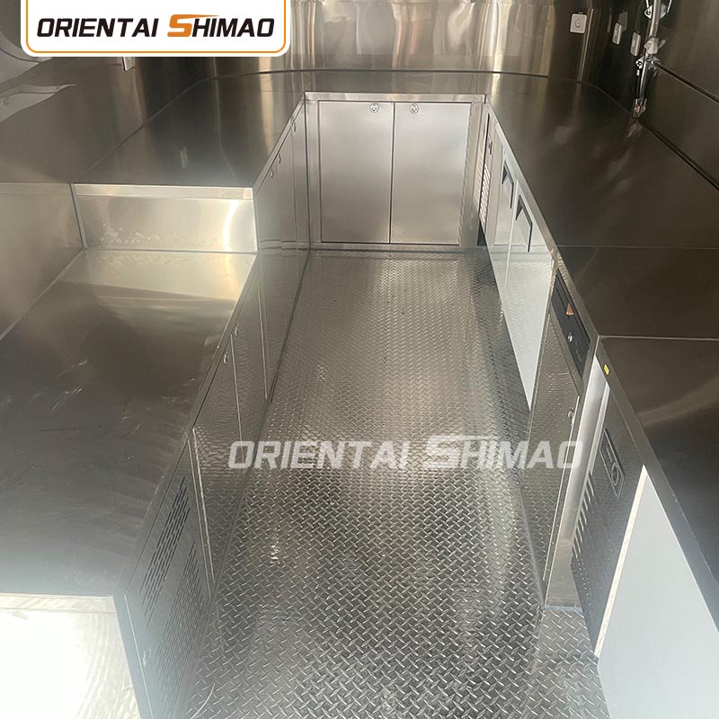 Trelagers golv: Golvet i foodtrucken är designat med tre lager. Det översta lagret är ett aluminiumgolv med halkfri yta för att garantera säkerheten för operatörerna; mellanskiktet är en australiensisk importerad insektssäker träskiva; och bottenskiktet är en glasfiberarmerad plast, som är fukt- och insektssäker och förlänger golvets livslängd.