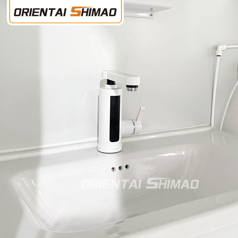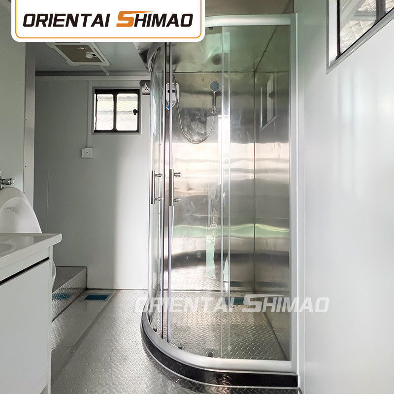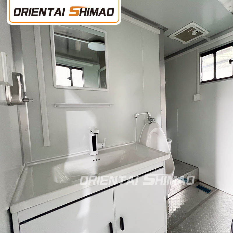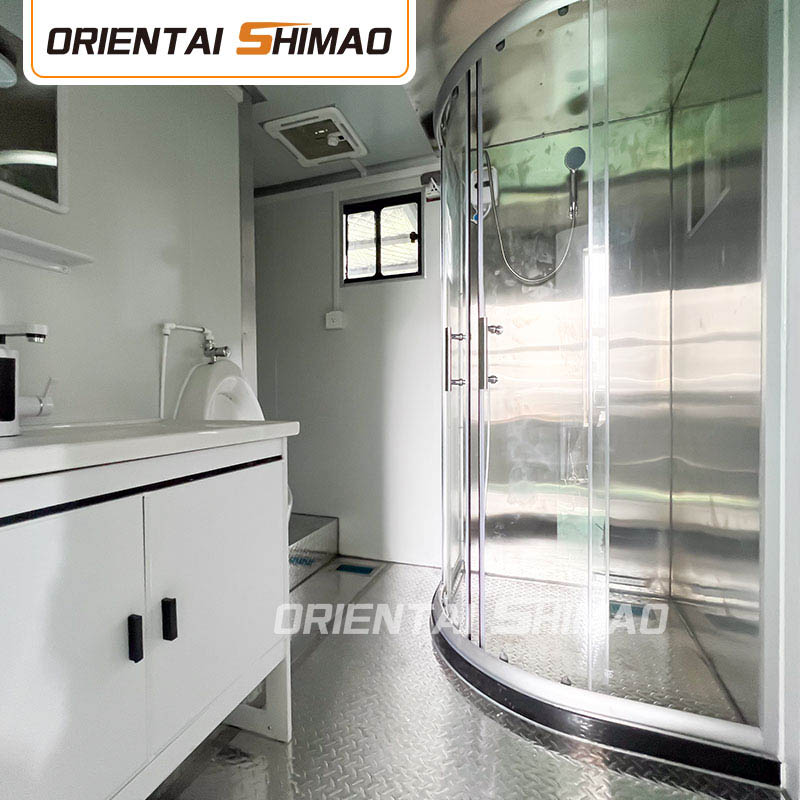 Modulär design: Denna sanitetsvagn antar modulär design, användare kan välja antalet enheter och konfigurationer enligt de faktiska behoven, såsom enkelrum, dubbelrum eller familjerum, etc., för att flexibelt möta behoven vid olika tillfällen. Varje enhet är utrustad med sitt eget ventilationssystem, handfat och belysning för att säkerställa komfort och avskildhet.