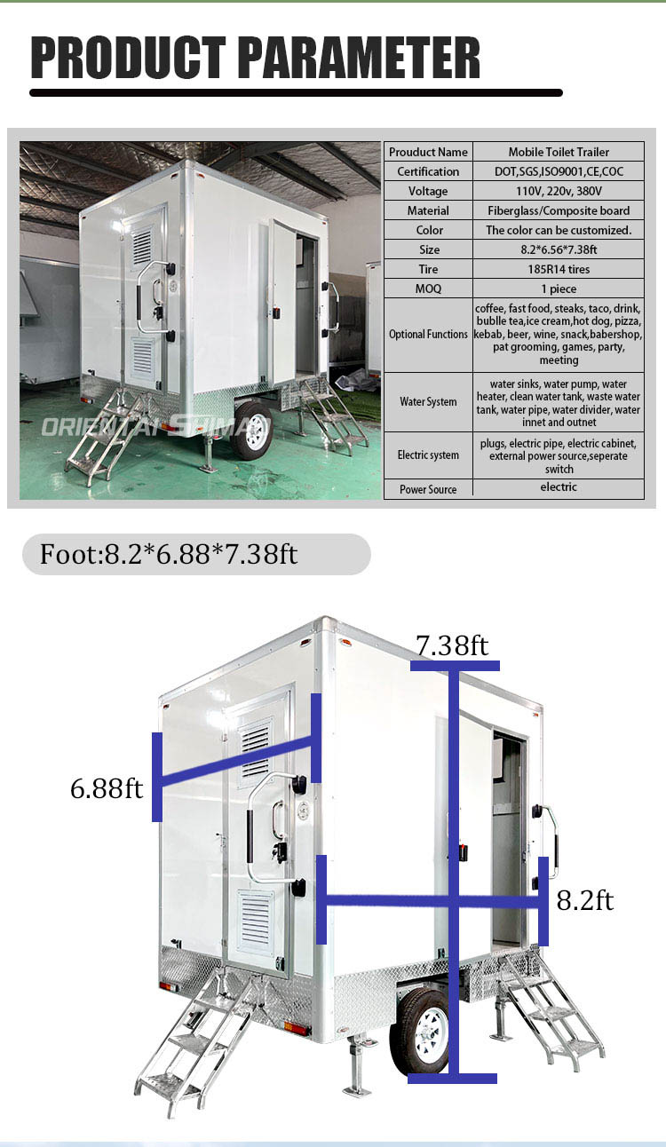 Utmärkt miljöprestanda: Den mobila sanitetsvagnen använder den mest avancerade miljöskyddstekniken, integrerar ett vattenbesparande spolsystem och en högeffektiv avloppsrening, som effektivt minskar vattenförbrukningen och utsläpp av föroreningar, vilket säkerställer miljöskydd och hygien under användningsprocessen.