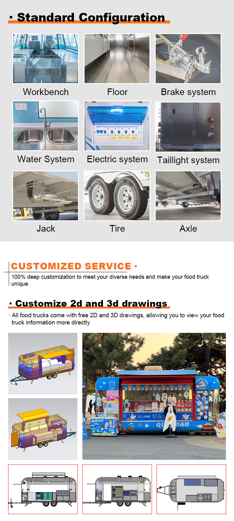 Som huvudmaterial valde vi högkvalitativt 304 rostfritt stål, som är känt för sin utmärkta korrosionsbeständighet och utmärkta hållbarhet, och kan bibehålla stabila prestanda under en mängd olika miljöförhållanden, vilket säkerställer att våra Food Catering Trailers-produkter kan behålla sin utmärkta kvalitet och funktionalitet även på lång sikt och möta en mängd olika utmaningar. 304 rostfritt ståls utmärkta motståndskraft mot korrosion, så att Lastbilen inte är lätt att påverkas av oxidation eller rost, vilket avsevärt förlänger dess livslängd. Den utmärkta korrosionsbeständigheten hos 304 rostfritt stål gör lastbilen mindre mottaglig för oxidation eller rost, vilket avsevärt förlänger deras livslängd.