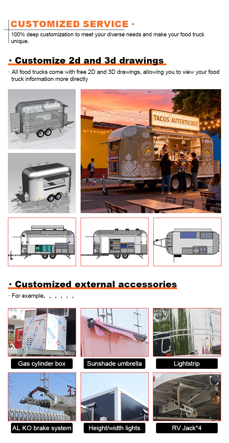 Som huvudmaterial valde vi högkvalitativt 304 rostfritt stål, som är känt för sin utmärkta korrosionsbeständighet och utmärkta hållbarhet, och kan bibehålla stabila prestanda under en mängd olika miljöförhållanden, vilket säkerställer att våra Food Catering Trailers-produkter kan behålla sin utmärkta kvalitet och funktionalitet även på lång sikt och möta en mängd olika utmaningar. 304 rostfritt ståls utmärkta motståndskraft mot korrosion, så att Lastbilen inte är lätt att påverkas av oxidation eller rost, vilket avsevärt förlänger dess livslängd. Den utmärkta korrosionsbeständigheten hos 304 rostfritt stål gör lastbilen mindre mottaglig för oxidation eller rost, vilket avsevärt förlänger deras livslängd.