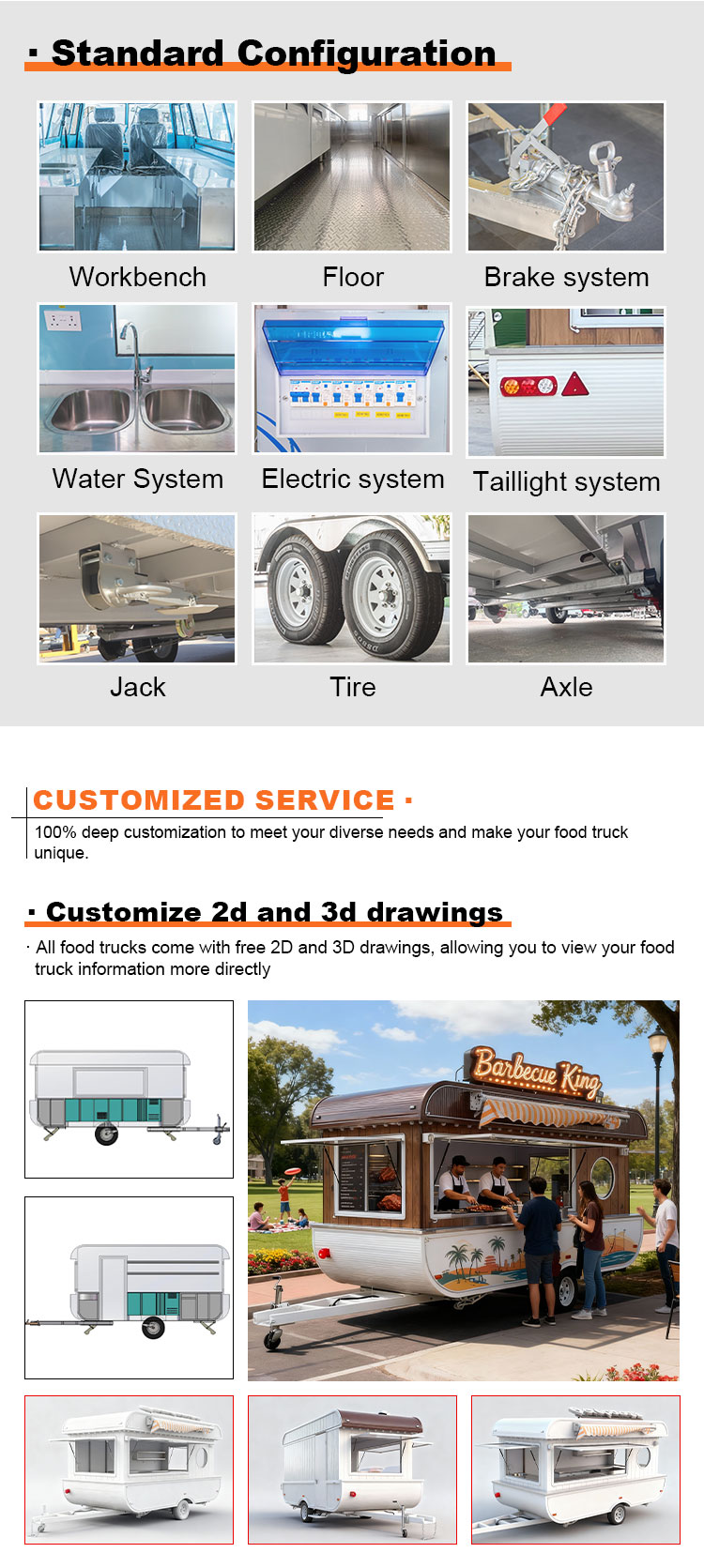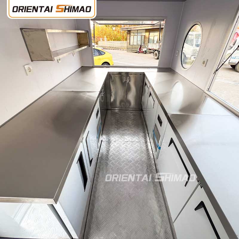 Som huvudmaterial valde vi högkvalitativt 304 rostfritt stål, som är känt för sin utmärkta korrosionsbeständighet och utmärkta hållbarhet, och kan bibehålla stabila prestanda under en mängd olika miljöförhållanden, vilket säkerställer att våra Food Catering Trailers-produkter kan behålla sin utmärkta kvalitet och funktionalitet även på lång sikt och möta en mängd olika utmaningar. 304 rostfritt ståls utmärkta motståndskraft mot korrosion, så att Lastbilen inte är lätt att påverkas av oxidation eller rost, vilket avsevärt förlänger dess livslängd. Den utmärkta korrosionsbeständigheten hos 304 rostfritt stål gör lastbilen mindre mottaglig för oxidation eller rost, vilket avsevärt förlänger deras livslängd.