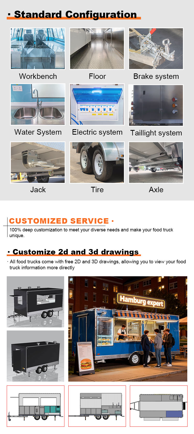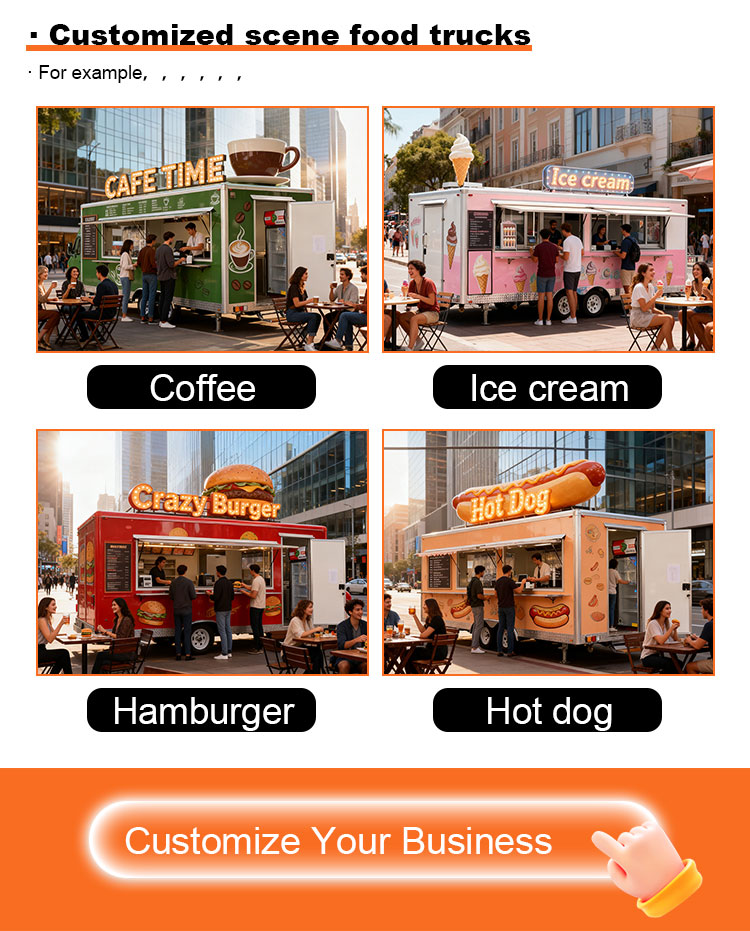 Modellering och stil: utseendemodelleringen och stilen på foodtrucken är en viktig faktor för att locka kunder. Den kan anpassas efter kundernas varumärkesimage, affärsegenskaper eller personliga preferenser, såsom strömlinjeformad design, retrostil, modern enkelhet och så vidare.