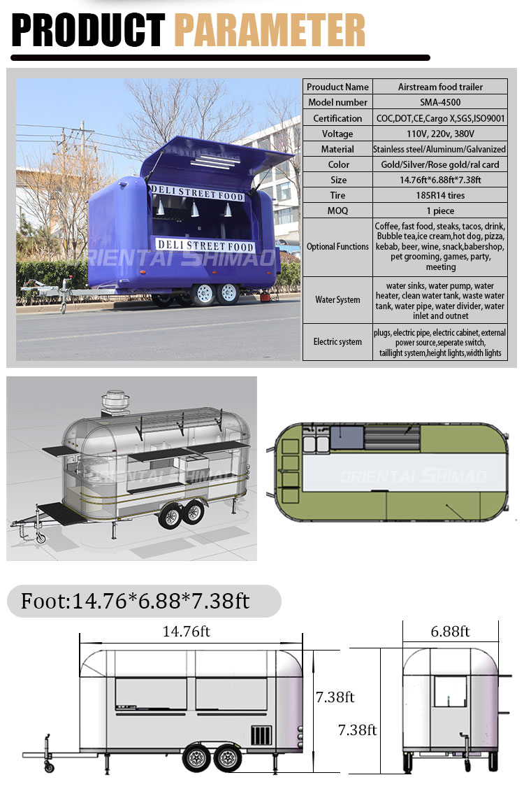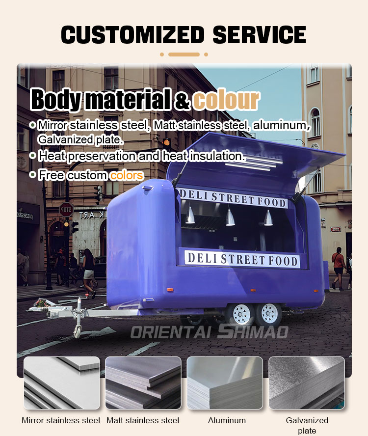 Food Van Trailer antar rostfritt stål som huvudmaterialet, som kännetecknas av korrosionsbeständighet, hög styrka, lätt att rengöra, vackert och hållbart. Dess yta bildar ett tätt kromoxidskikt, vilket effektivt förhindrar metallkorrosion och säkerställer livsmedelssäkerhet och hygien. Rostfritt stål har ett ljust utseende, starkt och hållbart, lätt att rengöra och underhålla, med en modern känsla, i linje med miljöhälsokraven. Därför är Big Food Trailers fullt utrustade material utmärkt, lämpligt för livsmedelsbearbetning och försäljningsmiljö, för att möta kundens efterfrågan på produktkvalitet och hälsorestor.