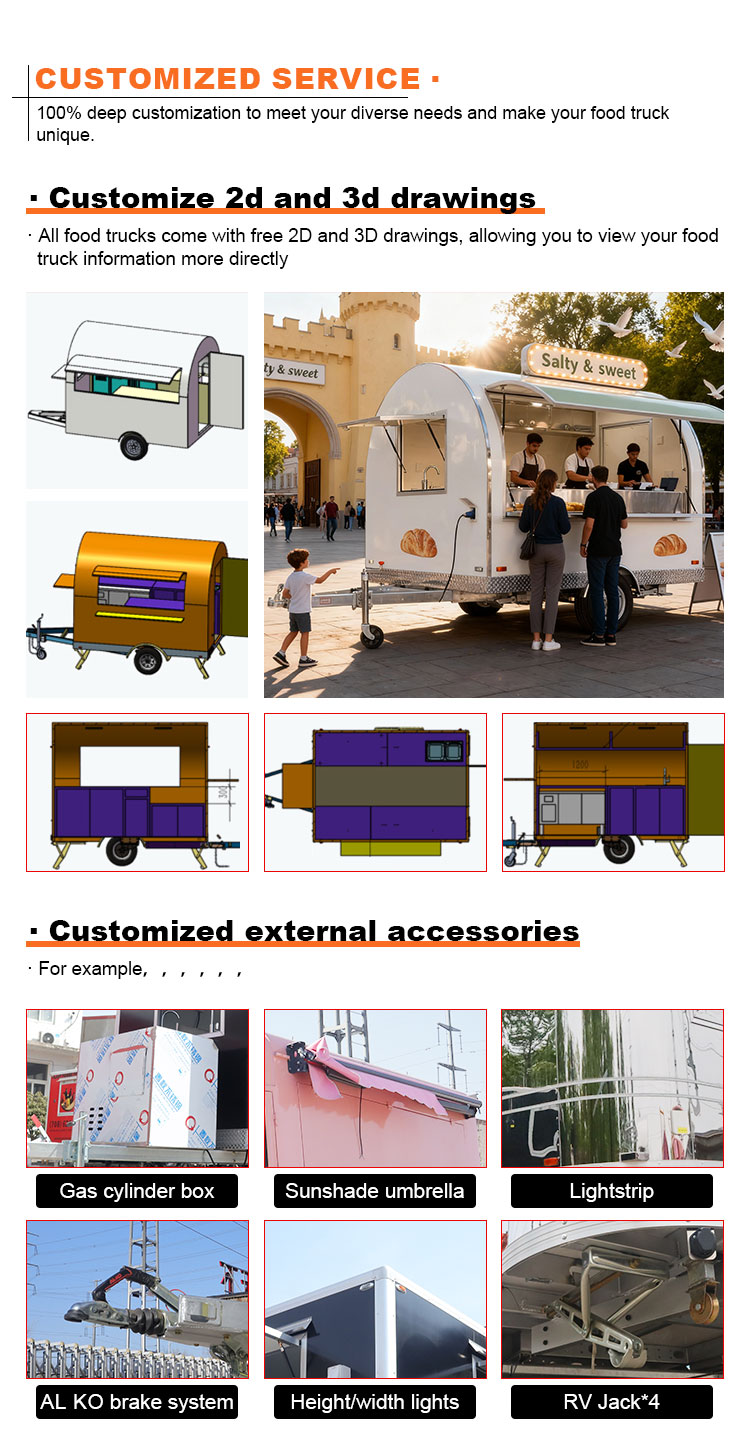 När det gäller tillbehörens material insisterar vi också på högkvalitativt urval, inklusive handtag i rostfritt stål, gångjärn och hjul och andra nyckelkomponenter, som alla är gjorda av högkvalitativa material. Denna design säkerställer inte bara den övergripande konsistensen och estetiken hos Food Van, utan förbättrar också dess hållbarhet och tillförlitlighet ytterligare. Tillbehörens utmärkta prestanda gör att Food Van blir mer stabil och smidig i användningsprocessen, och minskar även underhålls- och utbyteskostnaderna som orsakas av skador på tillbehören, vilket ger användarna en mer problemfri och ekonomisk användningsupplevelse.