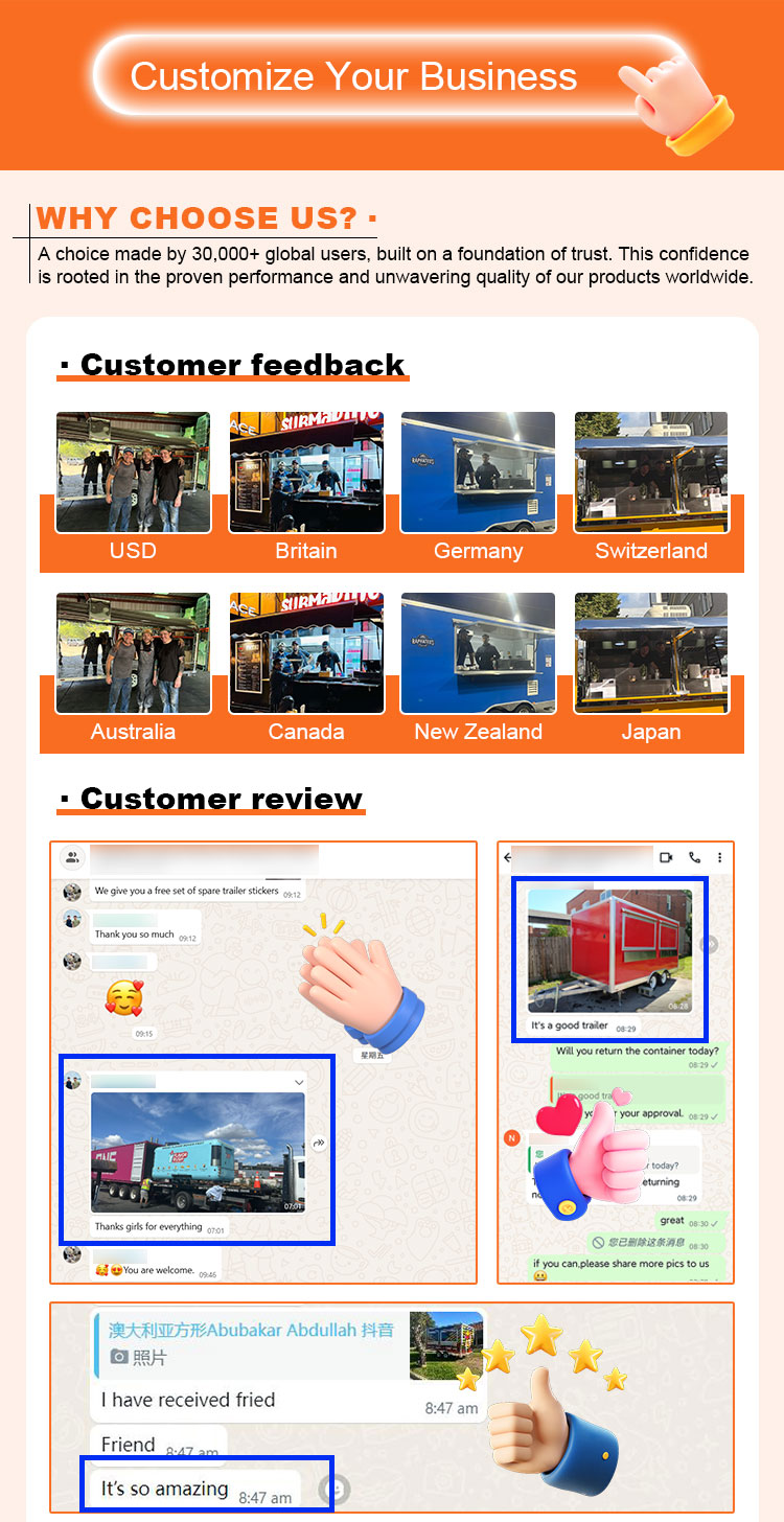 Som huvudmaterial valde vi högkvalitativt 304 rostfritt stål, som är känt för sin utmärkta korrosionsbeständighet och utmärkta hållbarhet, och kan bibehålla stabila prestanda i en mängd olika miljöförhållanden, vilket säkerställer att våra Food Van-produkter kan behålla sin utmärkta kvalitet och funktionalitet även på lång sikt och möta en mängd olika utmaningar. 304 rostfritt ståls utmärkta motståndskraft mot korrosion, så att Food Van inte är lätt att påverkas av oxidation eller rost, vilket kraftigt förlänger dess livslängd. Den utmärkta korrosionsbeständigheten hos 304 rostfritt stål gör Food Vans mindre mottagliga för oxidation eller rost, vilket avsevärt förlänger deras livslängd.