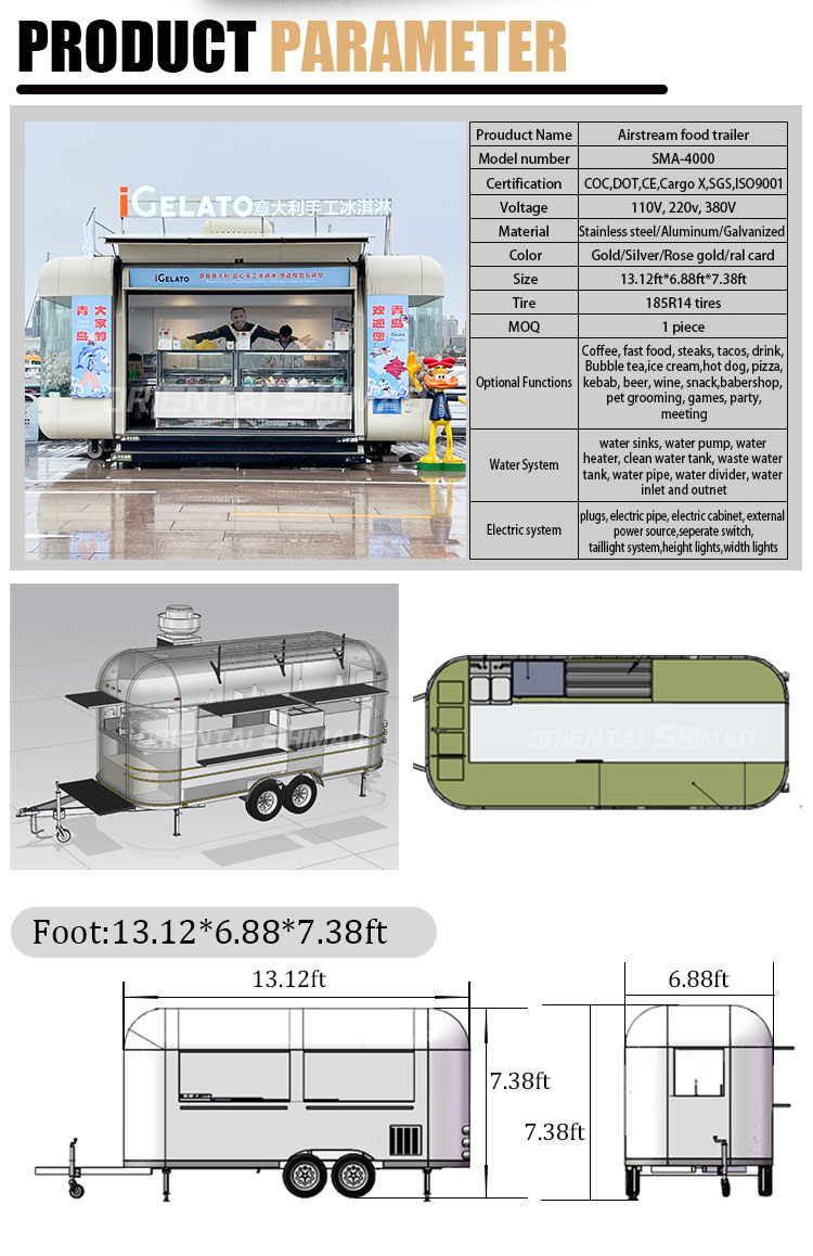 Gyllene rostfritt stål: utsidan av foodtrucken är gjord av högkvalitativt gyllene rostfritt stål. Detta material har inte bara utmärkt korrosions- och nötningsbeständighet, utan också det gyllene utseendet ökar den visuella skönheten och högkvalitativa känslan, så att foodtrucken kan sticka ut i olika miljöer.