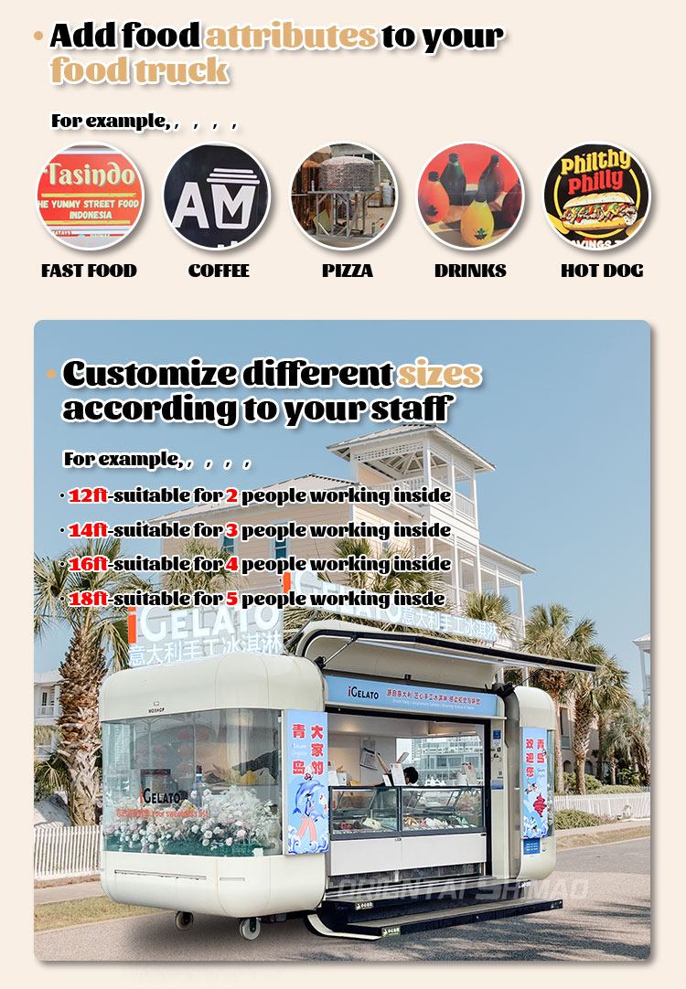 Modellering och stil: utseendemodelleringen och stilen på foodtrucken är en viktig faktor för att locka kunder. Den kan anpassas efter kundernas varumärkesimage, affärsegenskaper eller personliga preferenser, såsom strömlinjeformad design, retrostil, modern enkelhet och så vidare.