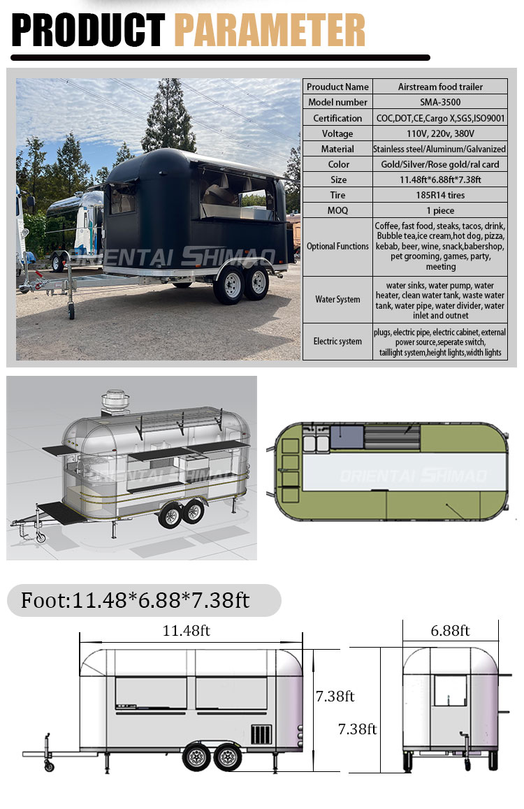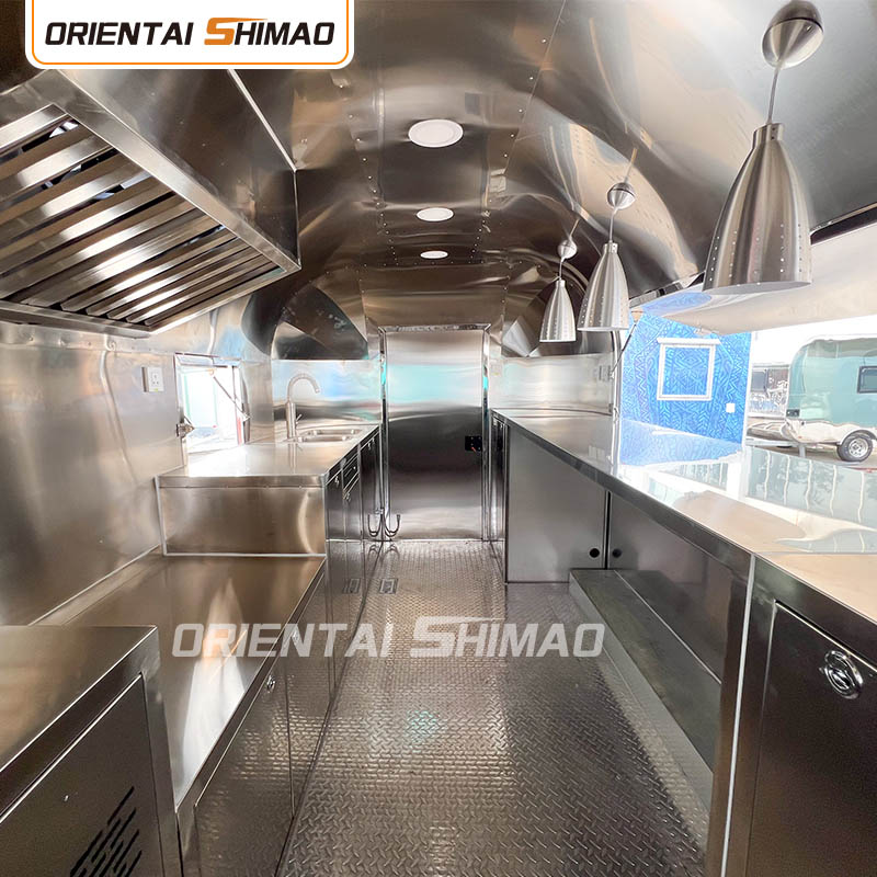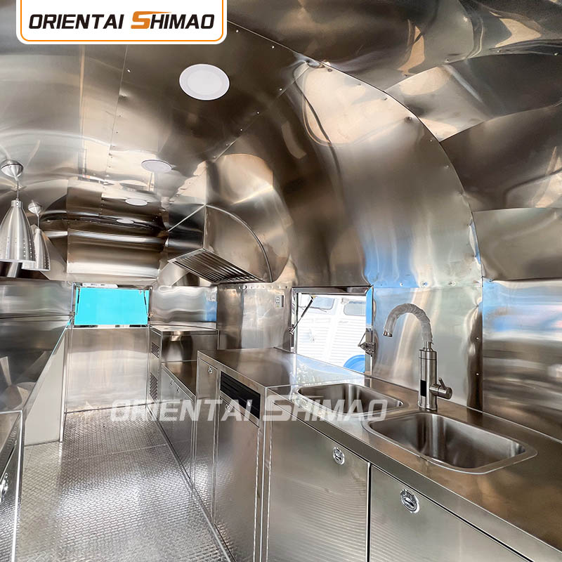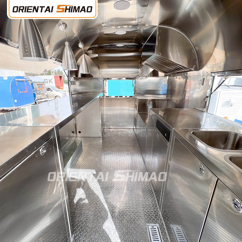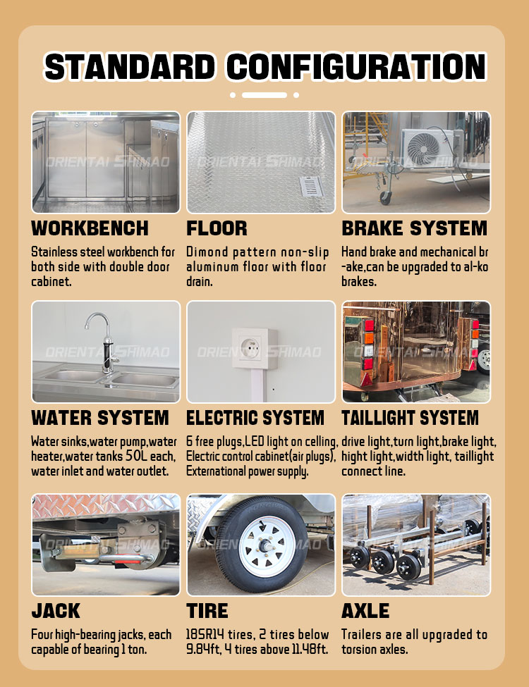 Gyllene rostfritt stål: utsidan av foodtrucken är gjord av högkvalitativt gyllene rostfritt stål. Detta material har inte bara utmärkt korrosions- och nötningsbeständighet, utan också det gyllene utseendet ökar den visuella skönheten och högkvalitativa känslan, så att foodtrucken kan sticka ut i olika miljöer.