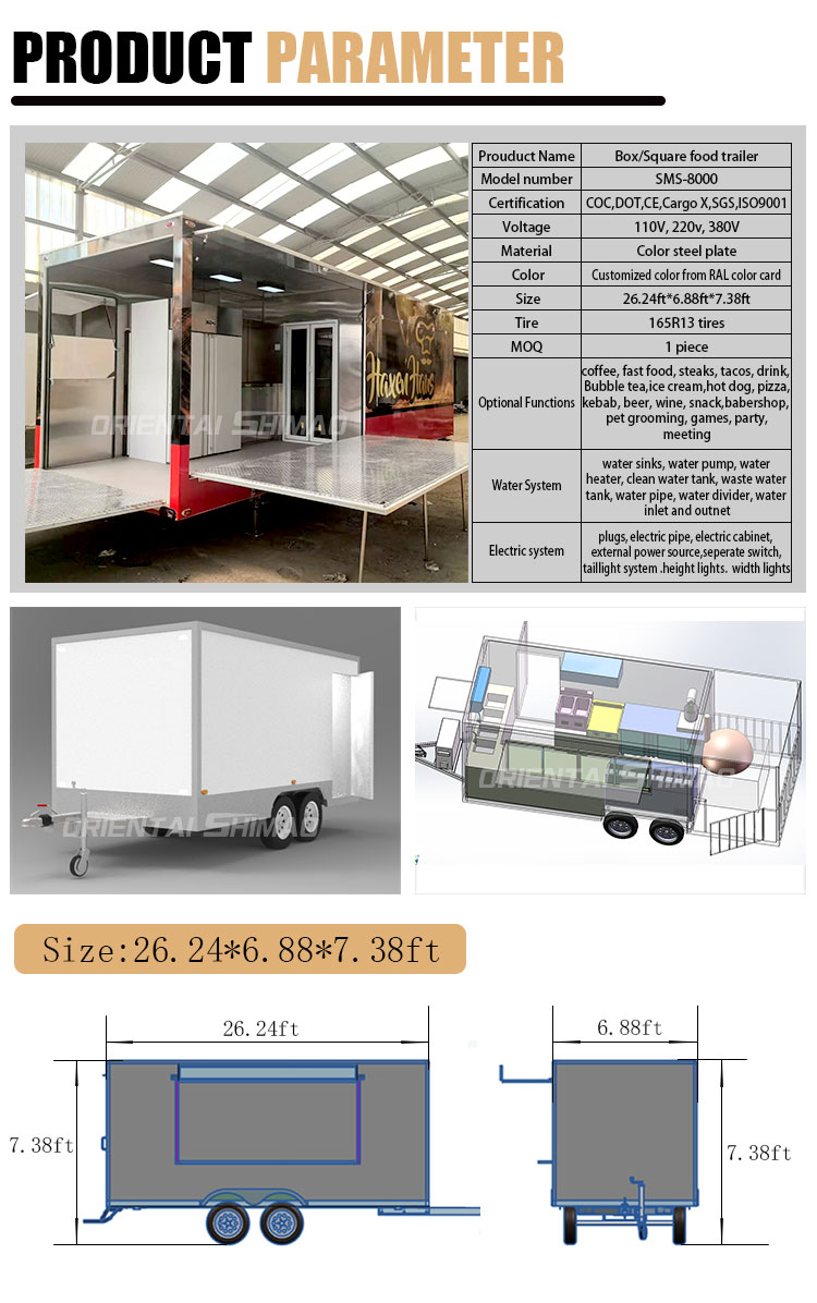 Modellering och stil: utseendemodelleringen och stilen på foodtrucken är en viktig faktor för att locka kunder. Den kan anpassas efter kundernas varumärkesimage, affärsegenskaper eller personliga preferenser, såsom strömlinjeformad design, retrostil, modern enkelhet och så vidare.