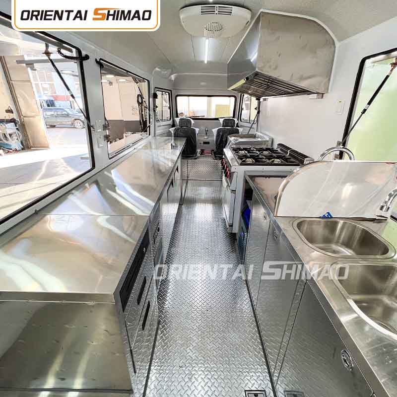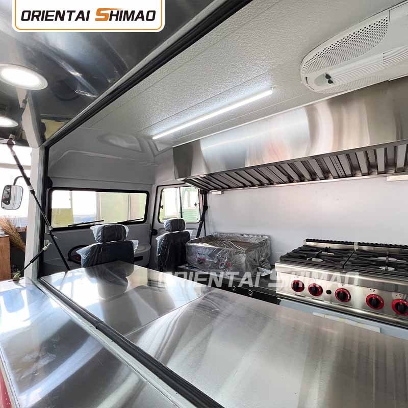 Inredning i rostfritt stål: Interiören är gjord av rostfritt stål, vilket säkerställer en stark och hållbar interiör som är lätt att rengöra och underhålla och som uppfyller livsmedelshygieniska standarder. Användningen av rostfritt stål förbättrar inte bara livsmedelsbilens livslängd, utan säkerställer också hygienen och säkerheten för matberedningen.