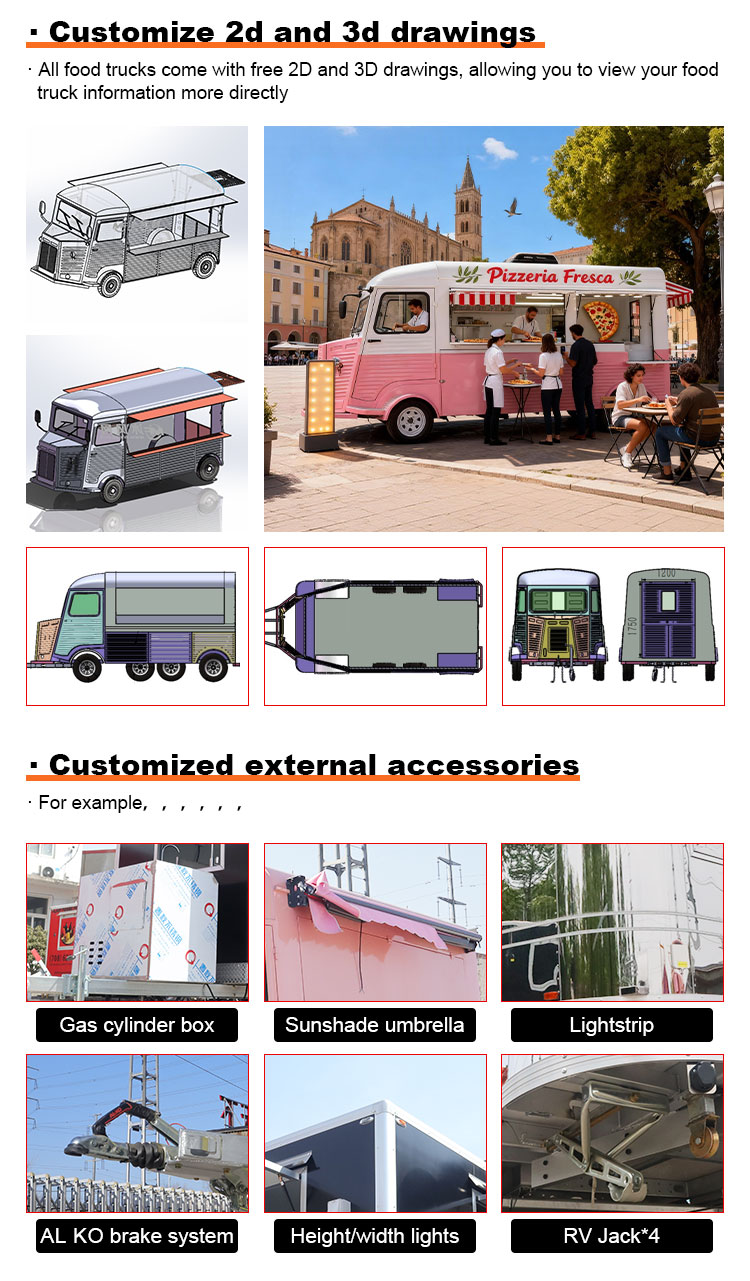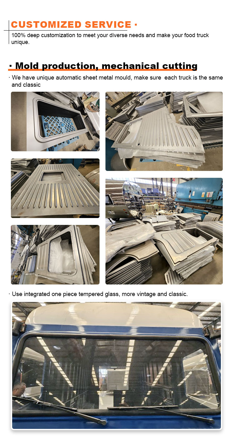 Modellering och stil: utseendemodelleringen och stilen på foodtrucken är en viktig faktor för att locka kunder. Den kan anpassas efter kundernas varumärkesimage, affärsegenskaper eller personliga preferenser, såsom strömlinjeformad design, retrostil, modern enkelhet och så vidare.